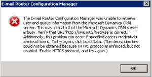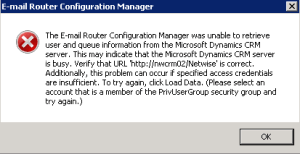 Najbardziej popularny błąd, jaki zobaczycie podczas konfiguracji Email Router’a to błąd podczas pobierania użytkowników i kolejek z CRM („The E-mail Router Configuration Manager was unable to retrieve user and queue information from the Microsoft Dynamics CRM server. This may indicate that the Microsoft Dynamics CRM server is busy. Verify the URL ‚…’ is correct. Additionally, this problem can occur if specified access credentials are insufficient. To try again, click Load Data. I TUTAJ WŁAŚCIWY PROBLEM”):