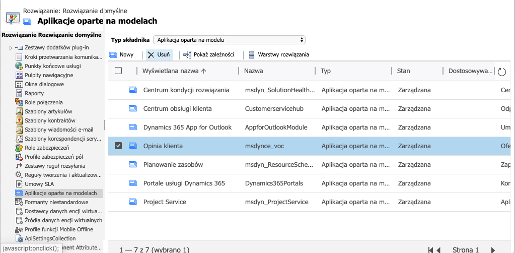 - Nic nie da też wchodzenie do naszego rozwiązania domyślnego (Default Solution), albo dowolnego innego i próba usunięcia Aplikacji opartej o modele (Model-driven application). W ten sposób jedyne, co możemy uzyskać, to błąd zależności, a aplikacja oczywiście nie zniknie: