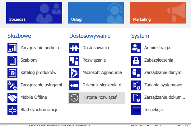 Tu na szczęście Dynamics 365 (i Power Apps) przychodzi nam z pomocą. Mianowicie, możemy (przez 15 lat nie mogliśmy) zobaczyć dokładną kolejność instalacji rozwiązań, wybierając w menu Ustawienia nowego, albo starego interfejsu „Historia Rozwiązań”: