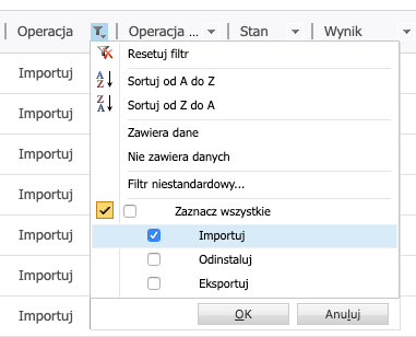 Wejdziemy wtedy na listę wszystkich operacji, które dokonywane były na rozwiązaniach (i aplikacjach) w Dynamics 365 i Power Apps. Na liście dostępne są wszystkie operacje oraz ich stany i daty, w których były wykonywane: